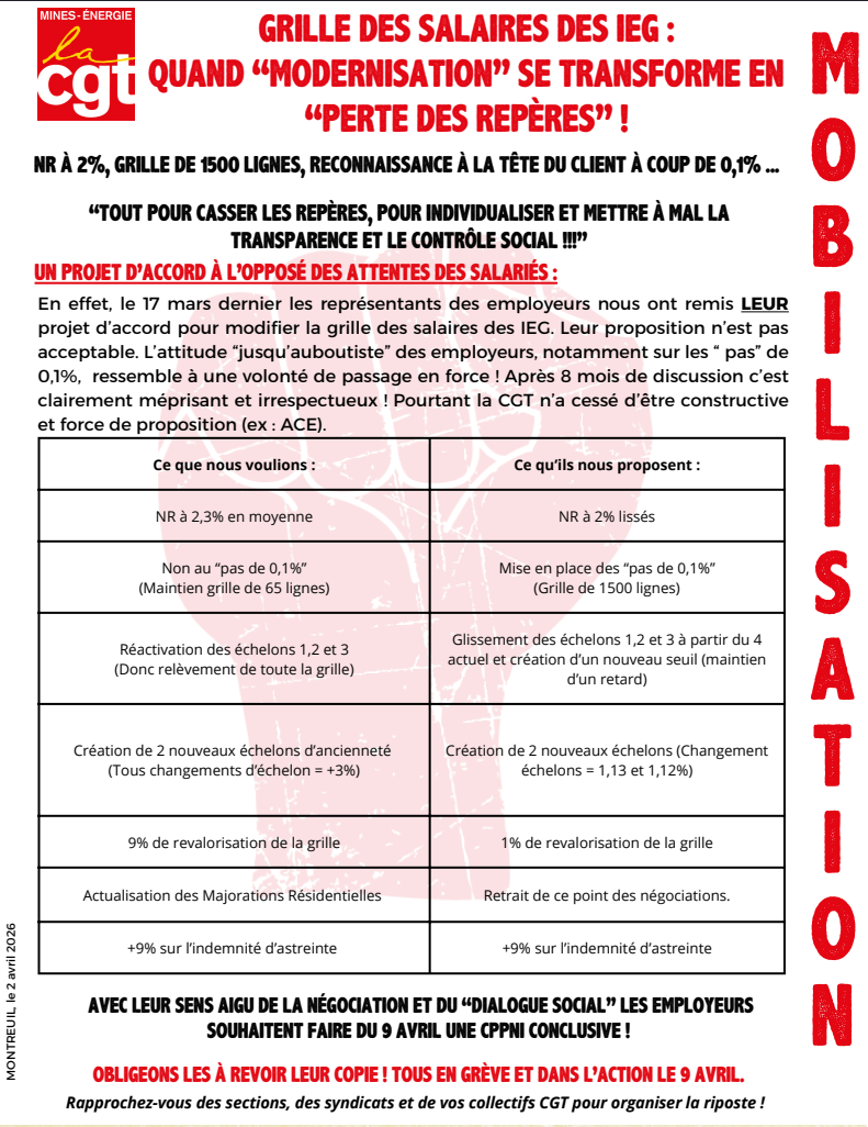 Actualités: CPPNI8 Avril – 80 ans de nationalisation8 Mars, On infuse l’égalité professionnelle …Séminaire Coordination CGT Groupe Engie 2025Du 14 au 28 Janvier 2025 – Elections LINK France ENGIEElections LINK – Des Hommes et des Femmes pour que votre épargne change de CAPRÉMUNÉRATION VARIABLE DES CADRES CHEZ ENGIESOUVERAINETÉ NUMÉRIQUE EN DANGERPROJET MOSAR À ENEDISTARIFS DE L’ÉLECTRICITÉ : D’AUTRES SOLUTIONS SONT POSSIBLES !RÉMUNÉRATIONS VARIABLES DE LA PERFORMANCE : UN LEURRE !RESULTATS ENGIE 2023 : Entre spéculation et subventionsLes managers des Industries Electriques et Gazières témoignent…Les enseignements clés pour comprendre le télétravail8 MARS : ON LUTTE POUR LES DROITS DES FEMMES !Mobilisation du 19 JanvierENGIE dans la tourmenteVente EQUANS- une procédure hâtive pour cacher les périls à venirENGIE, EQUANS un autre avenir que la vente est possiblePlan Clamadieu à 3 ans : une nouvelle saignée pour le GroupePlan Clamadieu, groupe éparpillé, salariés sacrifiésNon à la vente de Suez, non au démantèlement d’EngieLe President d’ENGIE annonce la vente du Groupe par morceauxEngie : le retour des licenciements boursiersDividendes chez Engie : un problème pour le développement socialENGIE – Résultats 2019Everything You Wanted to Know About mega city’sMetro city’s should make road with protection In mindMetro city’s should make road with protection In mindGo For Western Economy With These PioneeringWhere to travel asia Kind Mid SpiritCargo industry welcome foreign investmentOù VA LE GROUPE ENGIE?Mandat de Kocher et démantèlement du GroupeUne stratégie qui met en danger les emploisRésolutions AG actionnaires Engie : le vote de la CGTComptes 2018 : un bilan décevant, un avenir inquiétant; la CGT proposeEngie a supprimé 10 000 emplois en 3 ansExploration Production : les salarié-es sacrifié-esl’Etat prépare le démantèlement d’EngieRésultats 2017 : un appauvrissement du Groupeles documents de campagne CGTVente du GNL par EngieENGIE prône la fin des Tarifs RéglementésL’Etat libéral abandonne le service public du gazASSURER L’INVESTISSEMENT, LA FORMATION ET L’EMPLOIProduits dangereux : Engie supprime son équipe toxicologie GroupeRumeurs de rapprochement RWE-Innogy et EngieDélocalisation de l’activité commerciale gaz et électricitéEngie supprime 1900 emplois en France et délocalise la vente d’énergie (600 emplois)Plan social au Siège du Groupe EngieComptes Engie 2016 – stop à l’austérité et au démantèlementCentre Relation Client : dumping social et suppression de 600 emploisExternalisation des centres d’appelUn Conseil d’Administration qui manque de rigueurStratégie ENGIEChiffrage des revendicationsAction CGT Engie Le 13 décembre 2016, les salariés avec la CGT revendiquent un socle social communEn Réseau N°10En Réseau N°9Appel à manifester 14,23 et 28 juinStratégie et suppression d’emplois: inconnue!Plan de rigueur : 10 000 emplois supprimésNouvelle rigueur « pour les salariés »Résultats du groupe: identique à 2014LA GUERRE DES CHEFS : Mauvais pour l’entreprise , mauvais pour les travailleursRigueur pour les salariés pour payer les actionnairesJournal CGT du groupe GDF-Suez N° 7Journal CGT du groupe GDF-Suez N° 6Journal CGT du groupe GDF-Suez N° 5-2Journal CGT du groupe GDF-Suez N° 5Journal CGT du groupe GDF-Suez N° 4Journal CGT du groupe GDF-Suez N° 3Journal CGT du groupe GDF-Suez N° 2Journal CGT du groupe GDF-Suez N° 1Action unitaire jeudi 8 octobre 2015Négociations contrat social ENGIENégo Européenne avec les f d UESynthèse industrialProposition CGT Accord Contrat Social Groupe EngieAprès la retraite, les rémunérations stratosphériques des dirigeantsLa CGT demande des comptes sur la retraite du Président MESTRALLETPour 38 millions d’euros (0,08 % du capital), l’Etat abandonne sa souveraineté sur le gaz.Les soldes à GDF SUEZDépréciation massive, GDFSUEZ se délocaliseRisque de coupure de gaz et d’électricité en France : La FNME CGT demande une enquête parlementaireGDF SUEZ : Rigueur et suppressions d’emploisGDF SUEZ se désengage de l’environnementTerminal de Dunkerque : Première pierre du marché spéculatif du gazLes infrastructures gazières dans la tourmente de la libéralisation du marché de l’énergieTarifs progressifs de l’énergie.GDF SUEZ délocaliseRéapparition d’un serpent de merGDF Suez, distribue aux actionnaires, augmente le prix du gaz et oublie les salariés : la conception de l’équilibreGDF Suez, distribue aux actionnaires, augmente le prix du gaz et oublie les salariés : la conception de l’équilibreDans les tuyaux de GRTgaz : L’ouverture du capitalAccord mondial à GDF SUEZ : Mon monde à moi selon Mestrallet!Communiqué de presse du 02/15/10